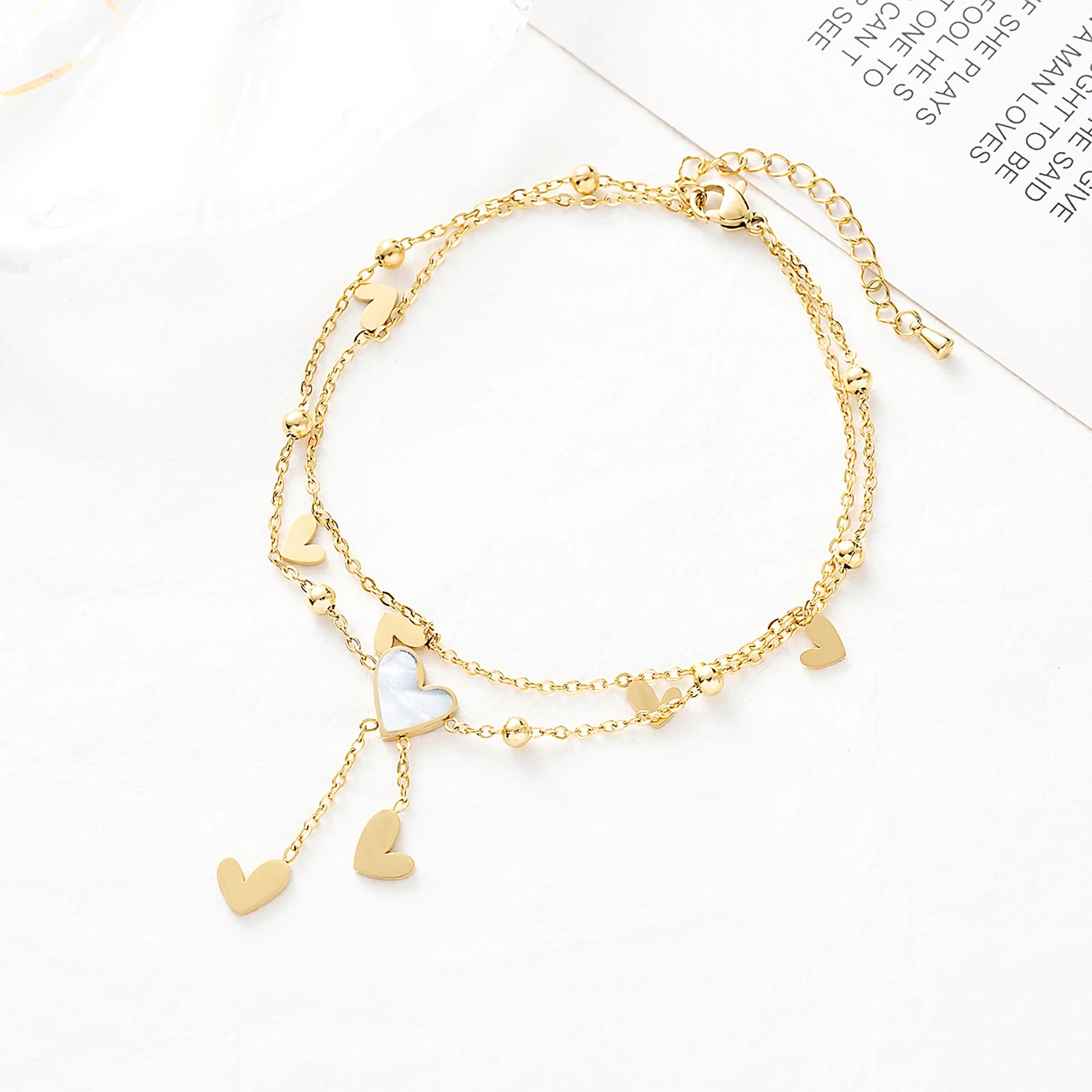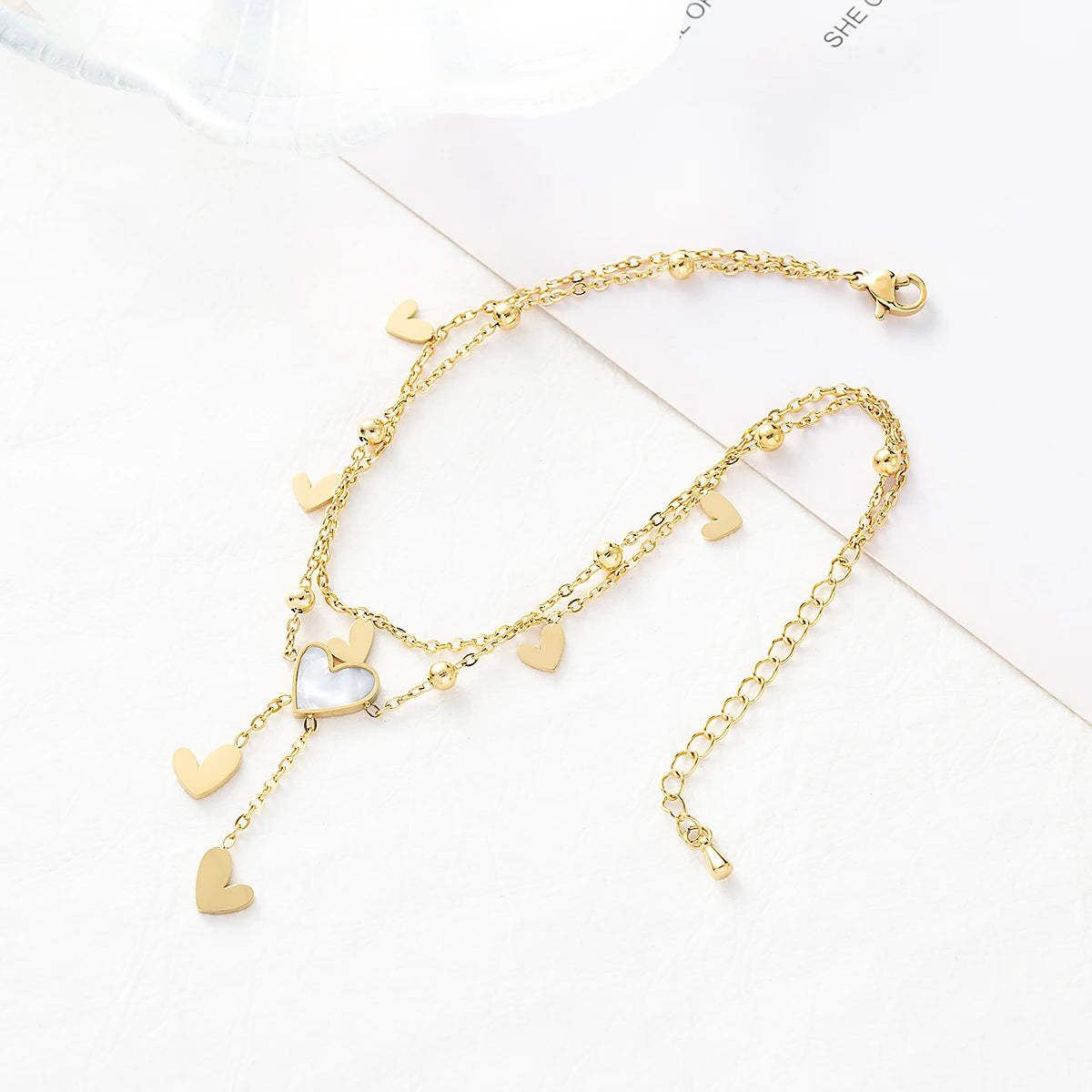 Elegante e luminosa, questa cavigliera a strati con cuore in conchiglia