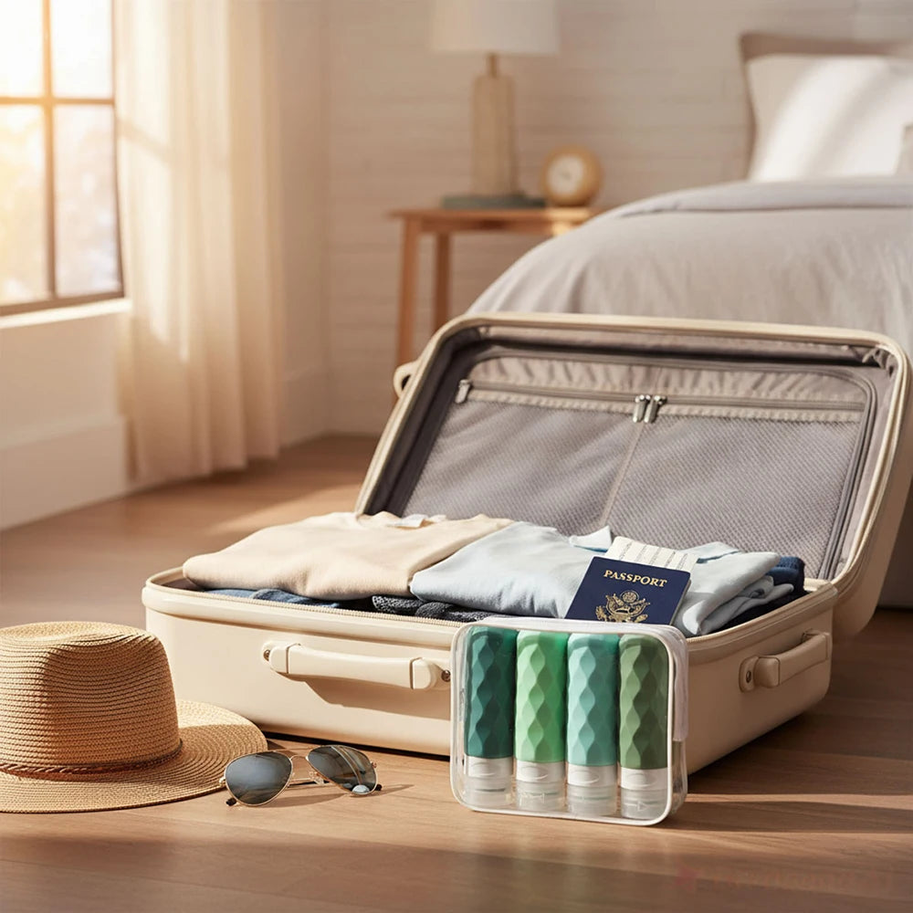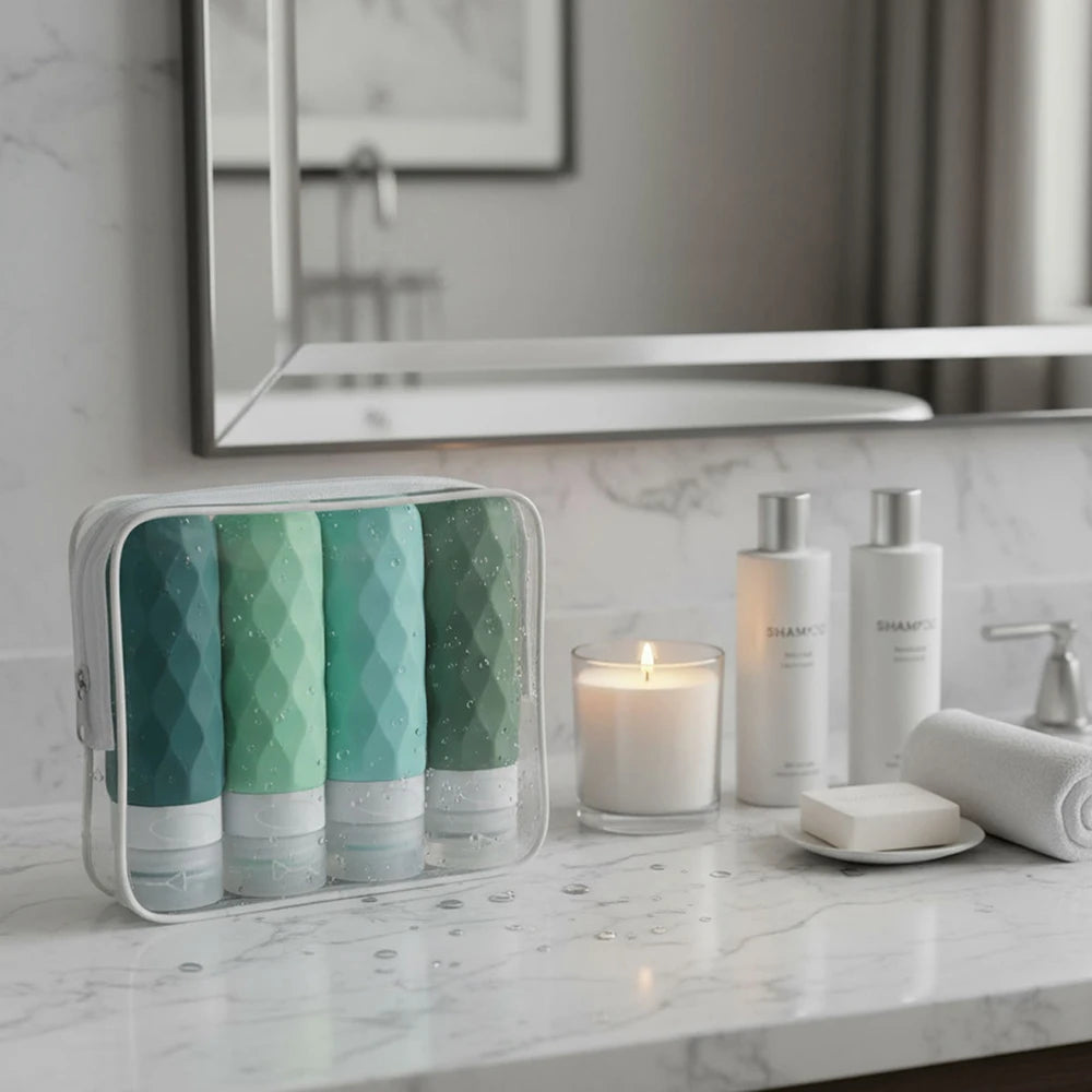 Un set pratico da viaggio: 4 flaconi in silicone ricaricabili per portare shampoo, lozione o body wash in modo ordinato e senza perdite.